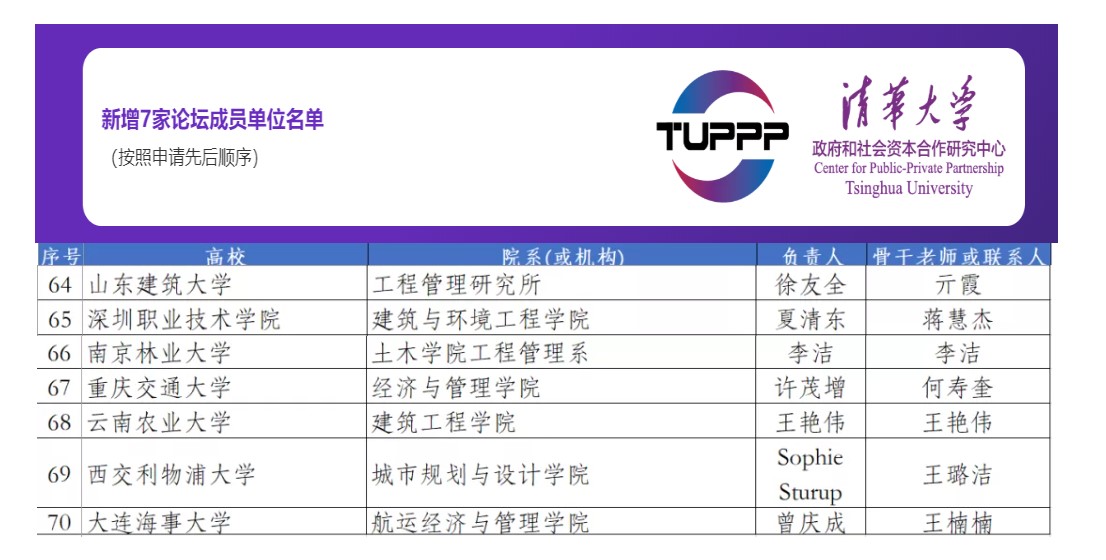 与其他六个高校科研机构成为中国高校PPP论坛的新增成员单位,至此论坛成员单位增至70家。按照规定,新成员加入需由3个以上的成员单位联名推荐,并经理事会审议通过。