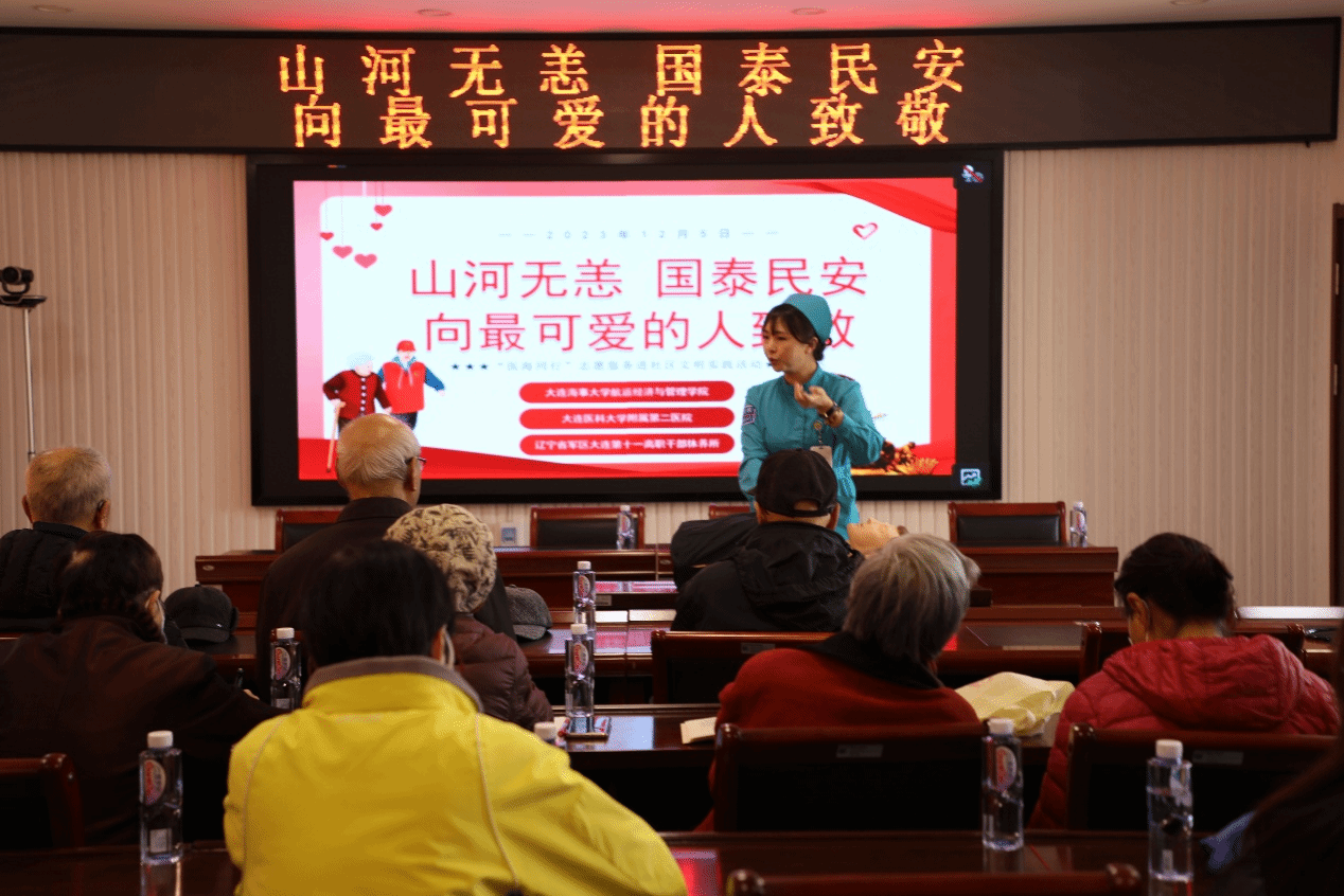 大连医科大学附属第二医院学雷锋志愿服务队医护志愿者为干休所的老战士及家属义务问诊,同时开展急救知识等现场培训。