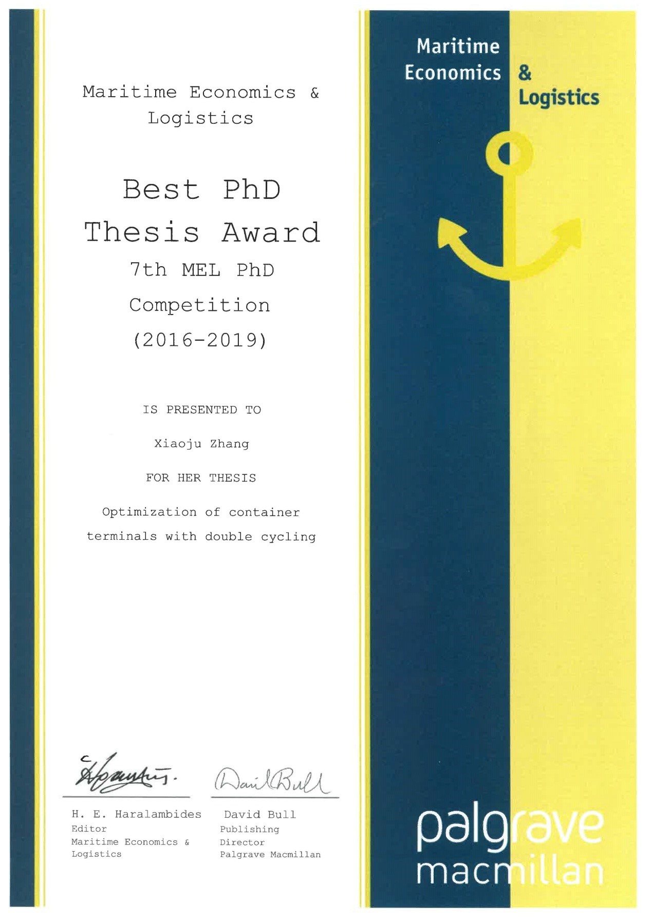 第七届MEL(Maritime Economics & Logistics)优秀博士论文评选会议于2019年6月21日在意大利热那亚举行,本次会议由航运领域旗舰期刊MEL主办,IAME(International Association of Maritime Economists)和热那亚大学承办,IAME主席Thanos Pallis教授、MEL主编Hercules E. Haralambides教授、热那亚大学Francesco Parola教授及热那亚港口局等人员出席了会议。会议每三年召开一次,至今已举办二十余年,受到了来自全球上千位博士毕业生的关注,会议评选出了2016-2019年航运经济物流领域取得博士学位的优秀博士论文,并对最佳、第二、第三名优秀博士论文获得者予以表彰,对航运领域的研究有重要意义。